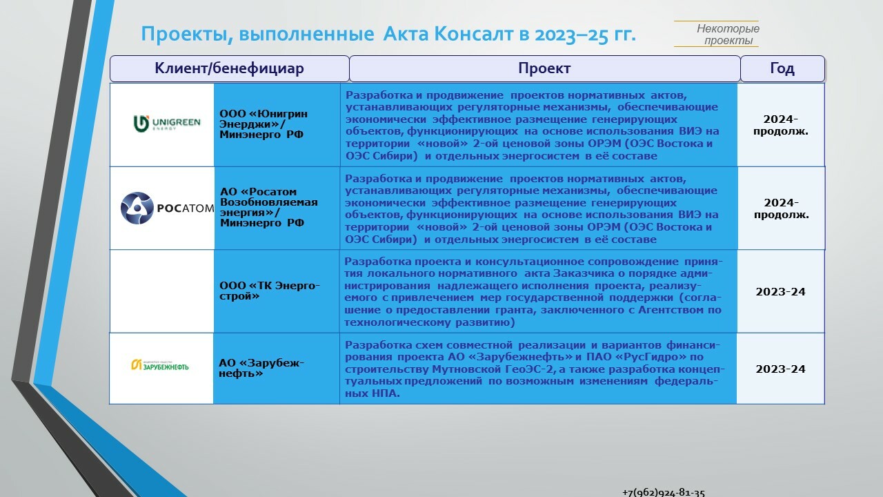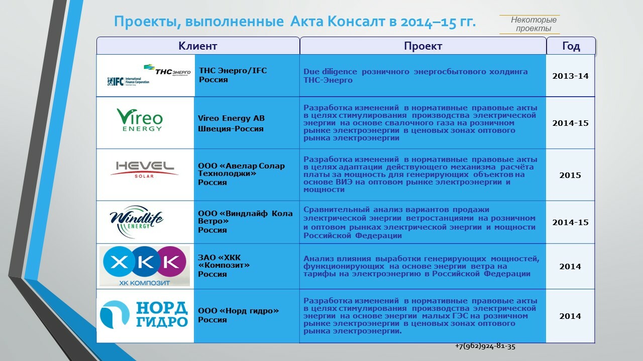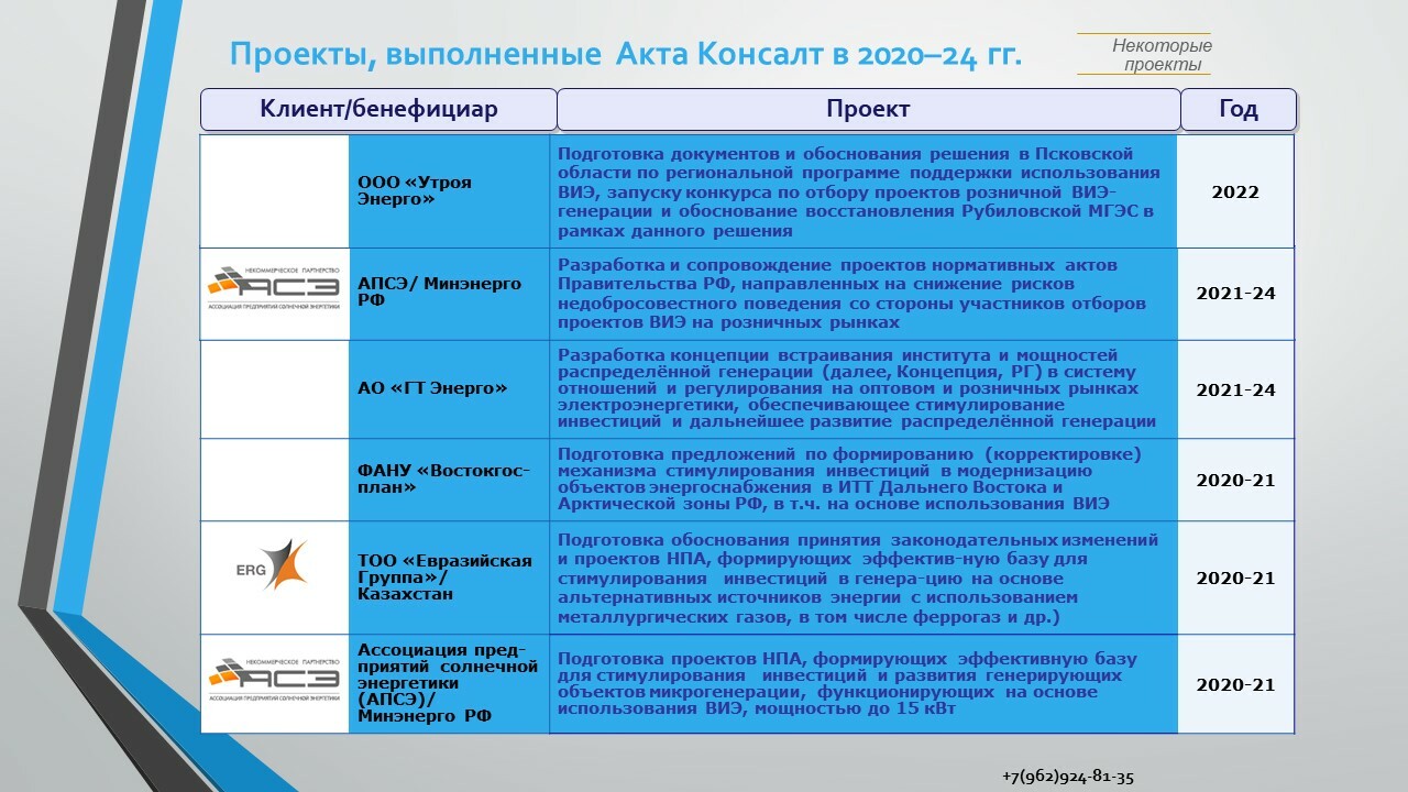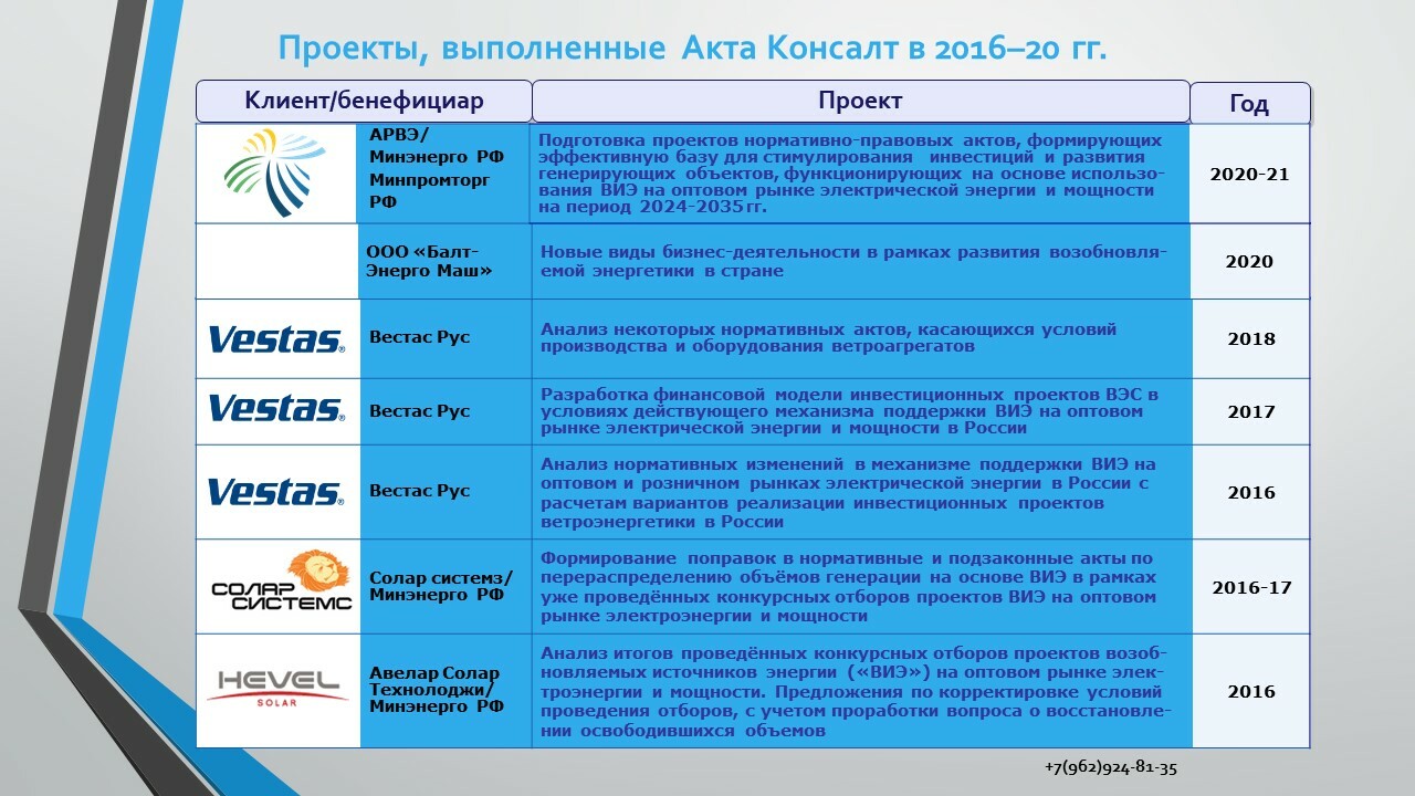 Компания ООО «Акта консалт» была создана в мае 2014 г. и с самого начала специализировалась на консультационных услугах в отрасли электроэнергетики. В настоящее время компания накопила огромный практический опыт в сфере совершенствования нормативной базы развития оптового рынка, розничного рынков, а также развития возобновляемой энергетики в России. Накопленный опыт позволил «Акта консалт» занять лидирующие позиции как консультанта в сфере ВИЭ и его нормативного обеспечения. Помимо энергетики ВИЭ компания развивает свои компетенции в сфере традиционной энергетики как на оптовых рынках электроэнергии и мощности, так и на розничных рынках электроэнергетики, в неценовых зонах оптового рынка и в изолированных энергосистемах. Специалисты компании располагают серьёзными компетенциями в сфере моделирования развития проектов и оценки экономической эффективности проектов электроэнергетики как на оптовом рынке, так и на розничных рынках, а также в неценовых зонах и изолированных энергосистемах. Бенефициарами проектных решений консультантов компании является не только корпоративный сектор электроэнергетики, но и отраслевые объединения и федеральные органы исполнительной власти, в частности, Минэнерго России.